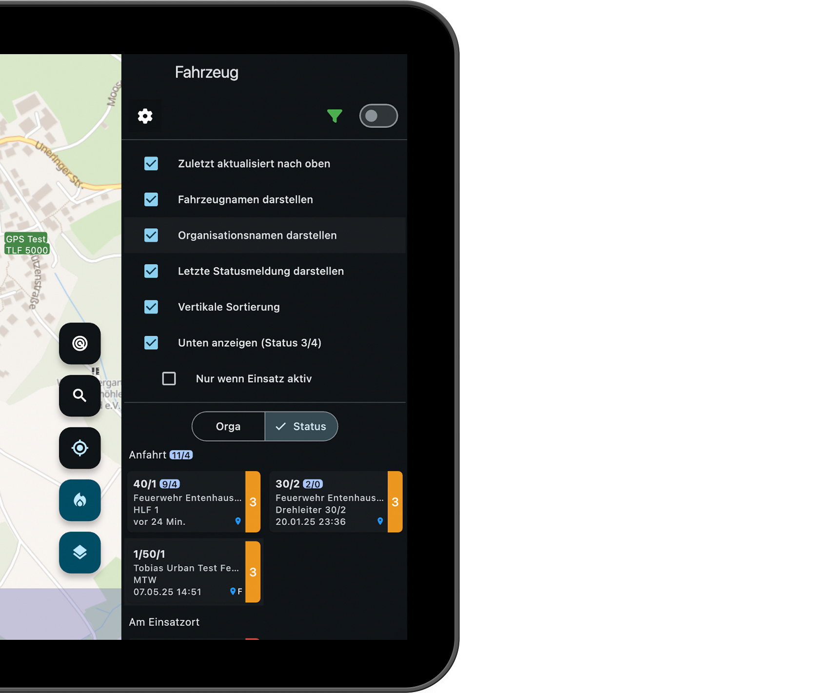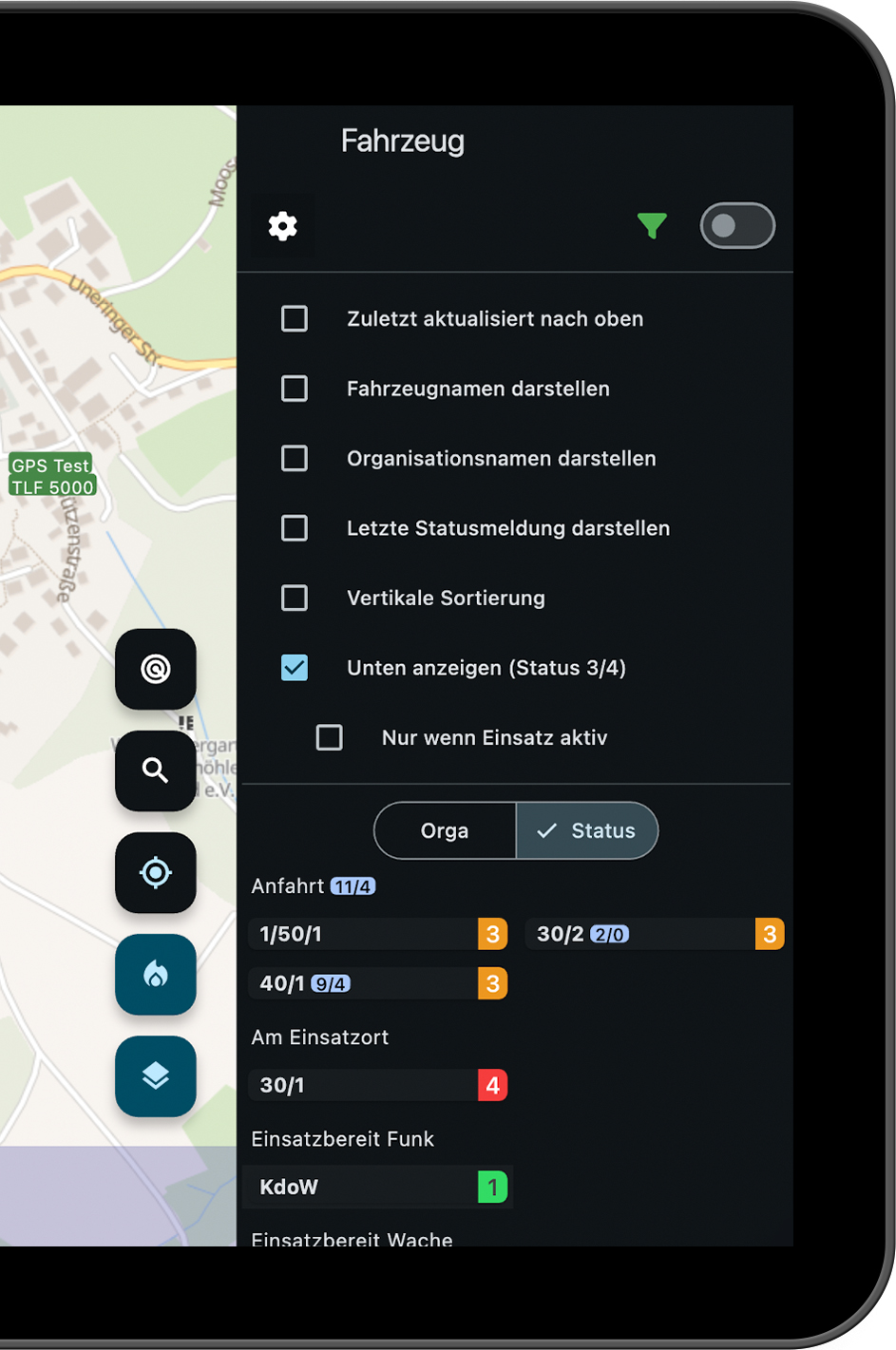 In der Status-View kann der aktuelle Fahrzeugstatus aller verknüpften Fahrzeuge eingesehen und gefiltert werden. Wurde eine Stärkemeldung abgegeben, wird diese neben dem Fahrzeug in der Übersicht dargestellt. Fahrzeuge mit einem Positionsmarker können direkt angesprungen werden, um die aktuelle Fahrzeugposition auf der Karte darzustellen.